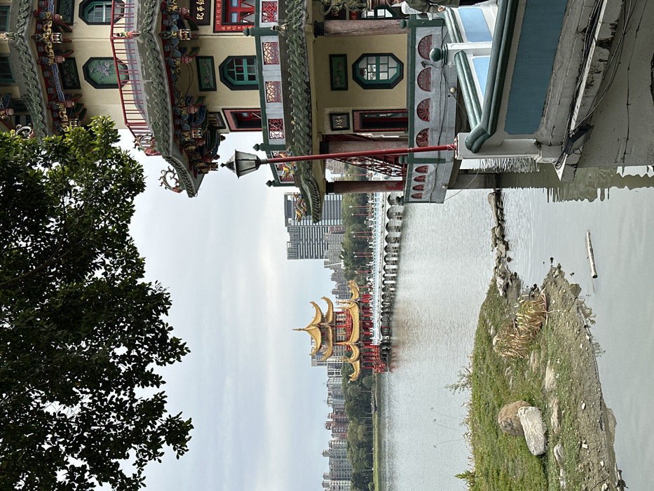 A rotated view features a vibrant, ornate building partially obscured by a tree, overlooking a tranquil lake. In the distance, a traditional golden pavilion stands on a bridge connecting to the city skyline. The scene includes a small island with vegetation, contrasting with the urban backdrop. The architecture displays intricate details and bright colors, set against an overcast sky.