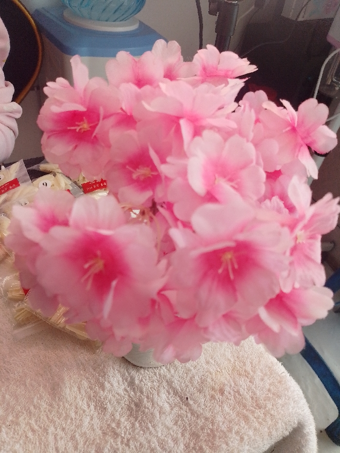 The scene, located in Limuru Central ward, Kenya, captures a dense arrangement of artificial pink flowers in a static, indoor setting. The flowers feature multiple light pink petals with distinct brighter pink centers containing yellow-white stamens. They are positioned in a small, light-colored cylindrical container, which rests on a textured, off-white fabric surface, likely a towel. To the left of the floral arrangement, several transparent plastic bags are visible, each containing numerous small, elongated, light-colored objects consistent with artificial fingernails. Some of these bags bear red labels with white text, including the numeral "9." The background to the left includes a dark, curved object, possibly a mirror or frame, and a soft pink fabric element. Centrally behind the flowers, a blue and white object with a ribbed blue top section, resembling a small appliance or dispenser, is present. Indistinct dark shapes suggesting additional equipment are visible in the far background to the right. No individuals, actions, or interactions are depicted.