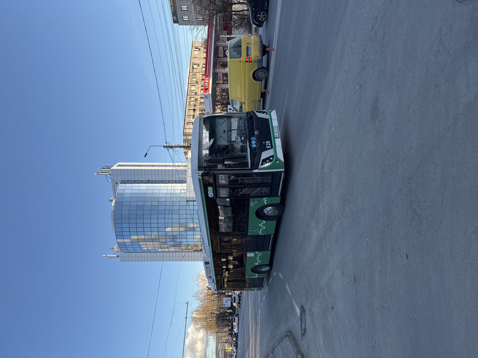 The image displays an outdoor daytime scene at the intersection of Strada Anastasie Panu and Strada Palatului in Iași, Romania, looking north towards the Palas complex. A white and green public transit bus, identified as an electric model "E28" and operating route "19 CASA CULTURII - C.P.U." with license plate IS 49 CTP, occupies the center-left of the asphalt road, angled towards the left foreground. In the background, to the left of the bus, a tall, modern high-rise building with a curved, reflective glass facade, consistent with the Palas Offices (UBC) complex, stands under a clear blue sky. Multiple antenna arrays are visible on its roof. To the right of the bus, a Lukoil gas station with a red canopy is present. A yellow cargo van is parked or stopped on the road near the gas station, with two orange traffic cones positioned behind it. A dark-colored passenger car is partially visible further to the right. The paved road features white lane markings. Overhead electrical wires are visible against the sky. Distant bare trees and other vehicles are present on a multi-lane road to the far left. No individuals are clearly discernible.