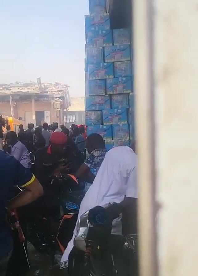 n outdoor scene with a crowd of people gathered near a building. A large stack of blue boxes labeled "NON DAIRY" is visible to the right of the frame, along a tall, light-colored wall. A man in a white outfit and a patterned hat is standing near a parked black motorcycle. Some people in the crowd are wearing casual clothes while others are in uniforms or police gear. In the background, a partially destroyed building can be seen. The day appears sunny and the atmosphere seems busy with activity.
