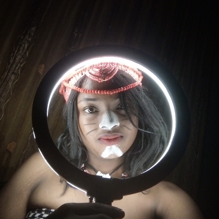 A person with dark hair and skin wears a red beaded headdress and a necklace of shells. White paint covers the nose, forehead, and below the mouth. Dark lines are painted on the cheeks. The person is holding a circular light, which creates a halo effect around their face. The background is dark, with some lighter patterns visible behind the light.