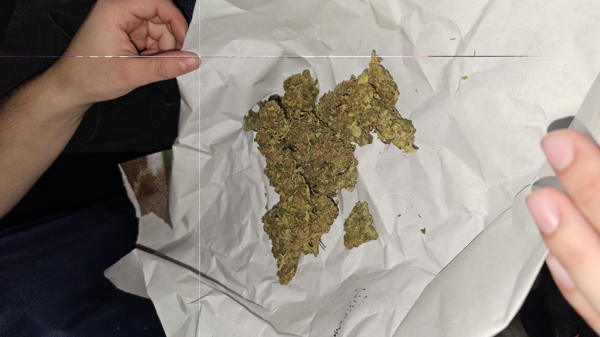- "A quantity of dried, green plant material, consistent with cannabis buds displaying visible orange-brown pistils, is centrally arranged on a piece of crumpled white paper" by FM-ua3Zg1, licensed under CC BY 4.0