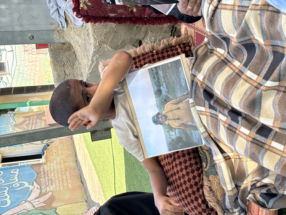 This image depicts an outdoor scene in Carmel, Palestinian Territory, centered on a young boy. The boy, appearing pre-teen with short dark hair, wears a light-colored t-shirt. He is seated on a brown and red patterned cushion, partially covered by a brown, tan, black, and orange plaid blanket that also extends over the lap of an unseen individual to his right. He holds a framed photograph of a smiling man in a yellow hoodie and a dark bucket hat, set against a natural outdoor backdrop. The boy's left hand is raised, partially covering his face, and his eyes appear sad. To the boy's immediate right, an adult's hand with a ring is visible resting on a red and gold patterned mat beneath the plaid blanket. In the background, a light-colored building wall is adorned with a colorful mural and text in both English and Arabic. Visible English phrases include "I REMEMBER MY MOTHER'S FACE...", "WE CAN FEEL SAD BUT WE CAN'T BE DEMORALIZED...", and "YOU CAN'T SEPARATE PEACE FROM FREEDOM BECAUSE NO ONE CAN BE AT PEACE UNLESS HE HAS HIS FREEDOM MALCOLM X". The ground directly in front of the wall appears to be green artificial turf, while a concrete or stone structure is visible behind the boy. The scene is illuminated by daylight.
