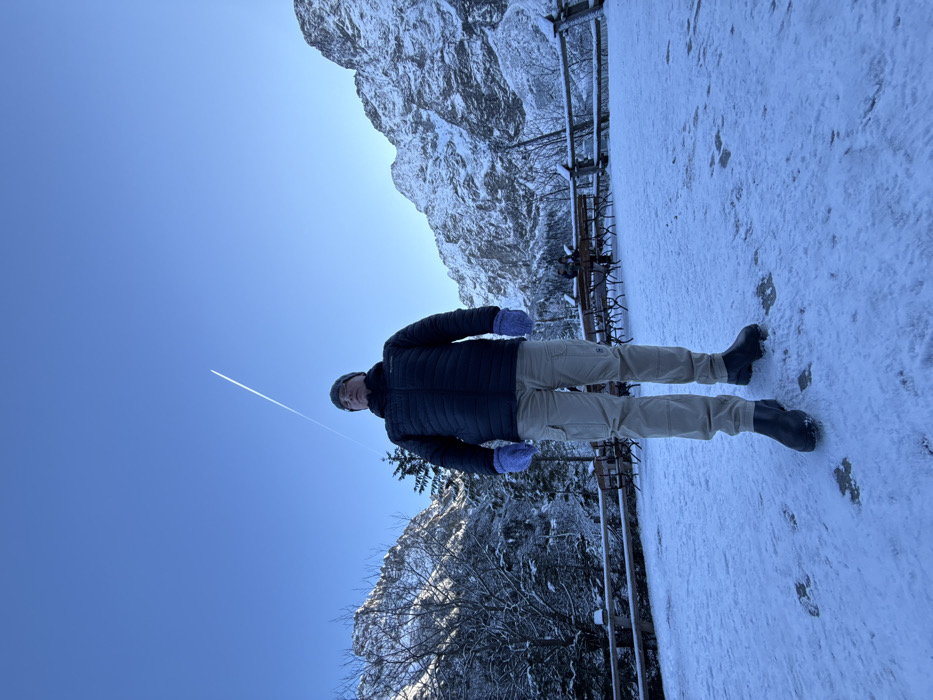 The image depicts a snow-covered outdoor scene in Brzegi, Poland, under a clear blue sky with a distinct aircraft contrail. A single adult male stands centrally, positioned slightly right of the camera, looking upward. He is dressed in a dark blue puffer jacket, tan cargo pants, light blue knitted gloves, a grey knit beanie, glasses, and black boots. The ground is covered in white snow, displaying multiple footprints. A wooden fence runs across the mid-ground, separating the foreground from an outdoor seating area. This area contains several dark-colored metal tables and chairs, partially obscured by snow. Two additional individuals are visible seated at a table on the far right. The background features prominent snow-covered mountains and coniferous trees, indicative of a mountainous winter environment.