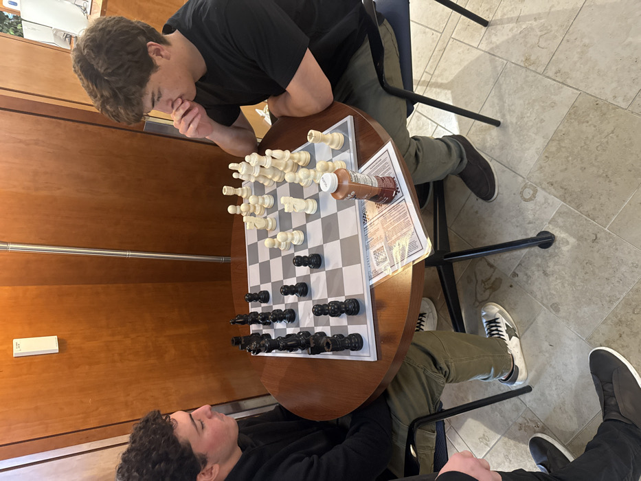 This image depicts an indoor scene within a common area in Waltham, United States, where two young adult males are engaged in a game of chess at a round, dark wood-grain table