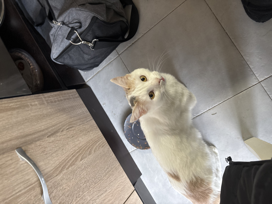 A domestic short-haired cat is positioned on a light grey tiled floor, gazing upward towards the camera with its tongue slightly extended. The cat exhibits a white coat with patches of light brown and grey, and possesses amber-yellow eyes. Adjacent to the cat's left, a dark-colored pet bowl containing remnants of food is visible. A segment of a kitchen cabinet with a light wood grain finish and a silver handle occupies the left side of the frame. To the right of the cat, a grey fabric duffel bag, equipped with a black strap and silver metal hardware, rests on the floor. A dark recessed area behind the bag and cabinet contains a clear plastic container. The scene occurs within a domestic interior in Sofia, Bulgaria. No human figures are fully depicted; however, a dark garment or object is partially visible in the bottom-left corner.