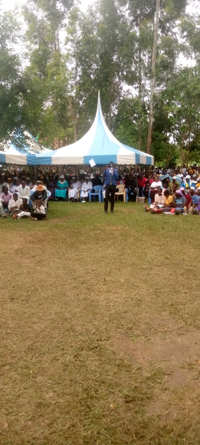 A large white and blue tent with a peaked top stands in a grassy field, surrounded by many trees. The tent covers a gathering of about 100 people, mostly sitting on chairs. A man in a blue shirt and black pants stands in front of the group, speaking into a microphone. The people in the crowd are listening attentively. The ground is mostly grass with some patches of bare soil. There are a few other tents in the background, as well as trees. This gathering is likely a community event in Burundu, Kenya. The coordinates (latitude: 0.46, longitude: 34.776) locate the scene in a rural area near the town of Burundu, which is situated in the Kenyan county of Siaya.