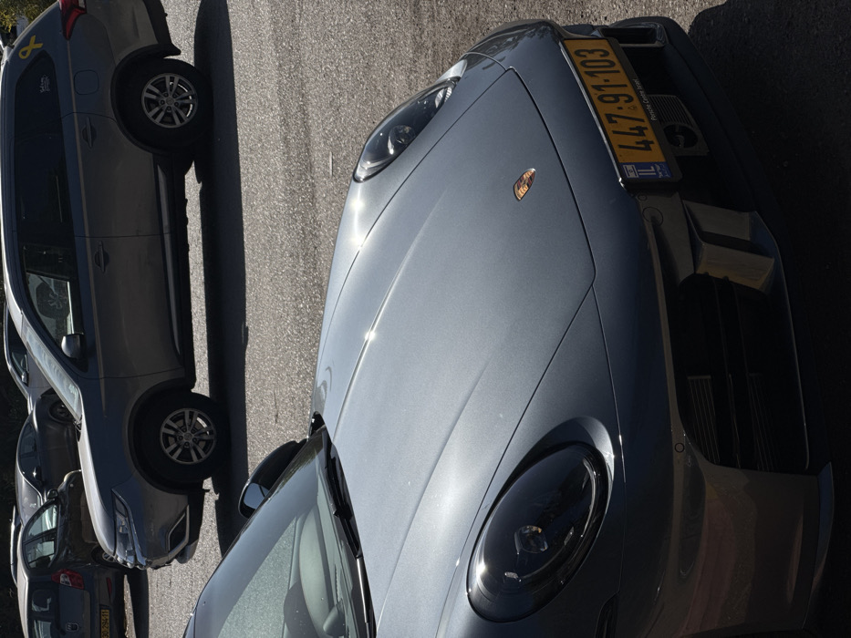 The image displays an outdoor parking area under direct sunlight, featuring multiple parked vehicles. In the immediate foreground, a dark grey Porsche 911, likely a 992 generation model, is prominently positioned, showing its front hood, dark-tinted headlights, windshield, and a portion of the front bumper. The Porsche crest is affixed to the hood. An Israeli license plate, "447:91-103," is mounted on the front bumper, with "Porsche Centre Israel" inscribed below it. Strong sunlight reflects off the Porsche's hood and windshield. In the background, on a slightly elevated or set-back surface, other vehicles are parked. A dark grey Mitsubishi Outlander SUV is visible behind the Porsche, displaying a yellow ribbon decal on its rear passenger window, along with another smaller white sticker. To the left of the Outlander, the rear of a dark grey Hyundai i10 hatchback is partially visible, bearing the Israeli license plate "30-294-11." Additional indistinct vehicles are visible further in the background. The ground is asphalt. No individuals are present in the scene. The image provides insufficient visual information to pinpoint the exact location within the Emek HaYarden Regional Council, Israel, beyond confirming it is an Israeli setting based on vehicle license plates.