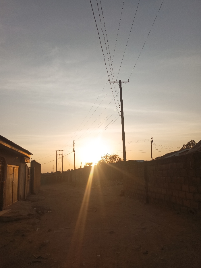This image depicts a dusty, unpaved residential street in Jos, Nigeria, during either sunrise or sunset. The sun, a bright yellow-white orb, is positioned low in the sky towards the center-right, casting strong lens flare diagonally across the scene and illuminating the environment with warm, golden light. The sky occupies the upper two-thirds of the frame, transitioning from a pale blue at the top to a bright yellow-orange near the horizon due to the sun. Multiple black utility wires stretch across the sky, originating from and connecting various wooden utility poles. A prominent wooden pole stands centrally, silhouetted against the bright sun, supporting numerous lines. Several other, smaller utility poles are visible further down the street. In the far distance on the left, a larger metal electricity pylon is faintly discernible. The ground is an unpaved dirt road, reddish-brown in color, extending from the foreground into the background. The road appears uneven with some scattered debris. On the left side of the road, a single-story building is partially visible. It has a dark roof and light-colored walls, possibly unpainted concrete, featuring at least two dark wooden panel doors. This building extends out of frame to the left. On the right side, a low, rough-hewn brick wall, possibly unpainted and made of red bricks, runs parallel to the road. Beyond this wall, further down the street, another building with a dark roof is partially visible. Sparse green foliage from small trees or bushes is visible behind the central utility pole and along the horizon line. No individuals, vehicles, or specific activities are present or discernible within the frame. The scene is static.