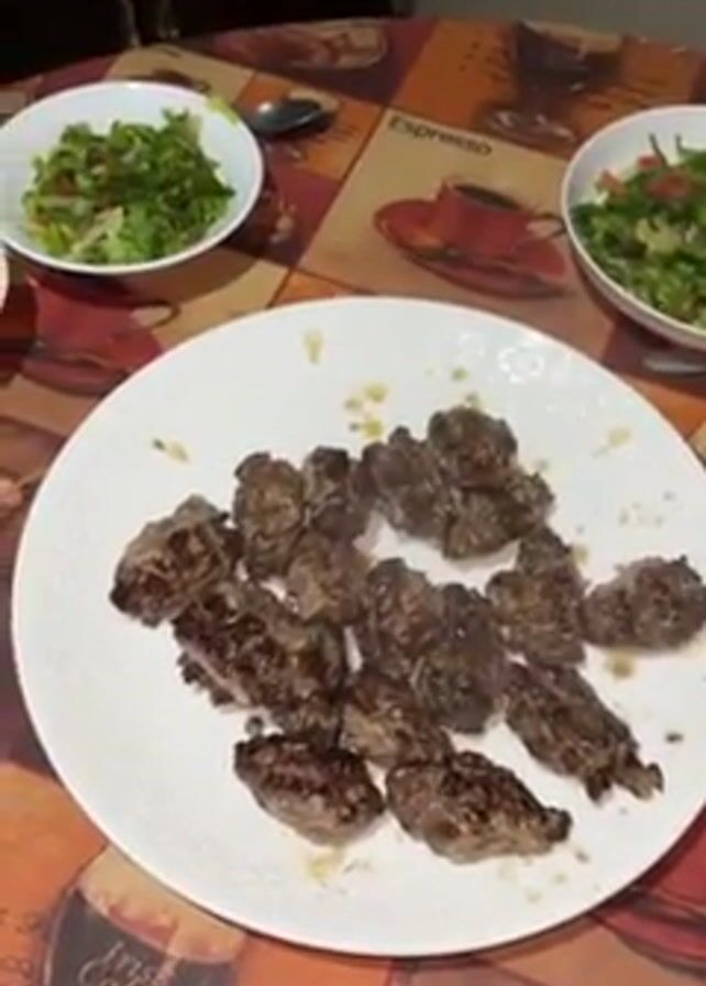 - "A dining table is seen with a plate of grilled meat, two bowls of salad, and two bowls of potato salad" by FM-YEyMx1, licensed under CC BY 4.0