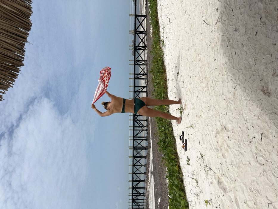 The image displays a beach environment in Zanzibar, Tanzania. A lone individual, seen from the back, stands barefoot on white sand, clad in a dark green two-piece bikini. Their light-colored hair is pulled into a bun. The person holds a red and white patterned cloth, likely a sarong or towel, over their head with raised arms. Two black and brown flip-flops are positioned on the sand to the left of the person's feet. The immediate foreground consists of sand with sparse green vegetation. A band of dark vegetation or seaweed spans the midground, leading to shallow water. A wooden pier, featuring dark supports and white railings, extends into the water in the background. The sky is light blue with scattered white clouds. A section of a thatched roof is visible in the upper right corner.