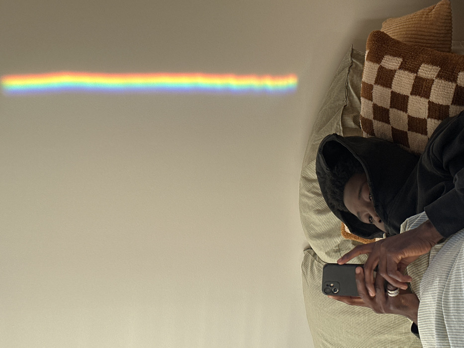 The image depicts an indoor scene in Saint-Ouen-sur-Seine, France, featuring an individual lying on a bed with multiple pillows. The person, an adult male with dark skin, is partially visible, wearing a dark hooded sweatshirt with the hood pulled up, obscuring most of his face except for his eyes. He is holding a black smartphone vertically with both hands, his gaze directed towards its screen. A silver ring is present on his left ring finger. Behind him are three types of pillows: at least two striped, light-colored pillows, one brown and off-white checkered pillow, and one solid brown corduroy-textured pillow. The background is a plain, light-colored wall. A distinct, vertical spectrum of rainbow light, displaying colors from red to violet, is projected onto the wall to the upper right of the individual.