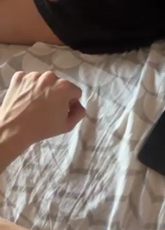 A person, likely male, lies in bed on a striped duvet cover. A person, likely female, sits next to them, wearing a black t-shirt and a silver bracelet. The male person places their hand over the female person's hand. The male person holds up a condom wrapper with a cartoon drawing. A smartphone sits next to them on the bed.