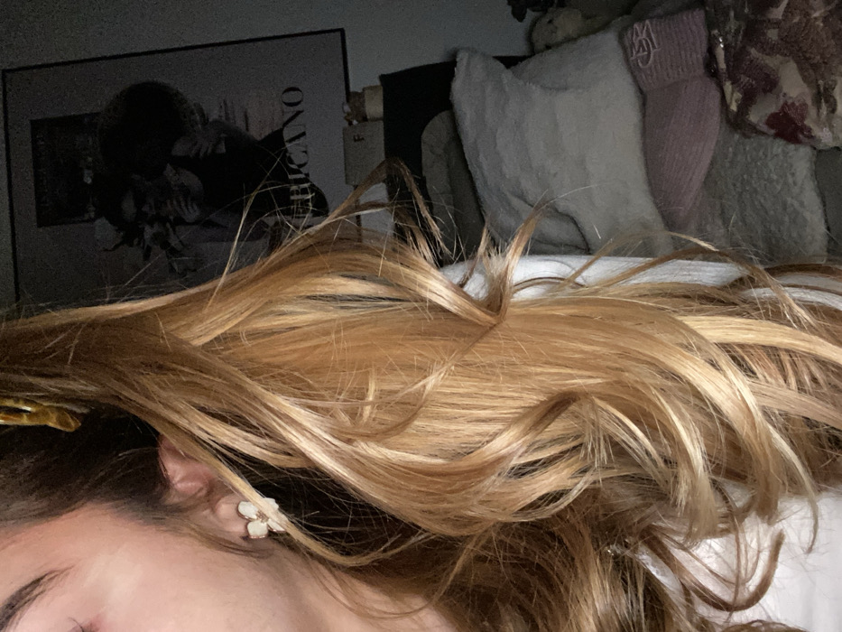 - "A close-up focuses on a person's light brown, wavy hair spread across a white surface, likely a bed" by FM-guE952, licensed under CC BY 4.0