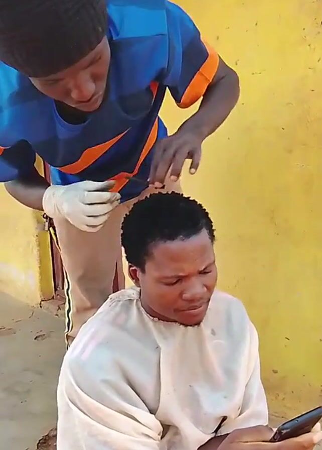A man in a black beanie and blue t-shirt is giving a haircut to a seated man. The barber is wearing white gloves and using clippers. The man getting a haircut is looking at a phone in his hands. He is wearing a white cape. They are outside in front of a yellow wall.