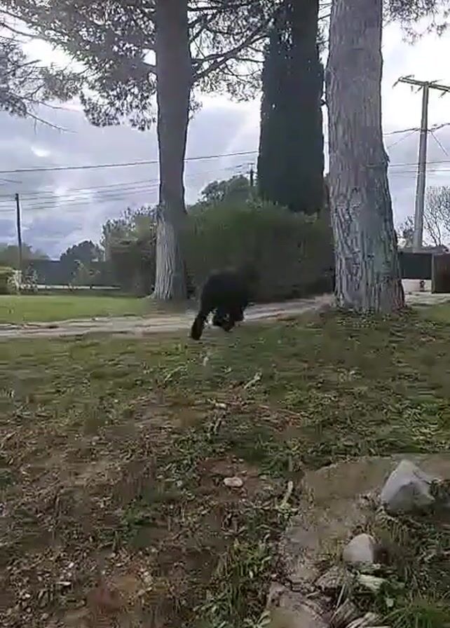 A black dog runs toward the camera in a grassy area with trees. The dog is medium size with long, shaggy fur. There are several trees in the scene, including pine trees and cypress trees. There is also a bush and a utility pole in the background. The ground is covered in grass, leaves, and some stones. The sky is overcast.
