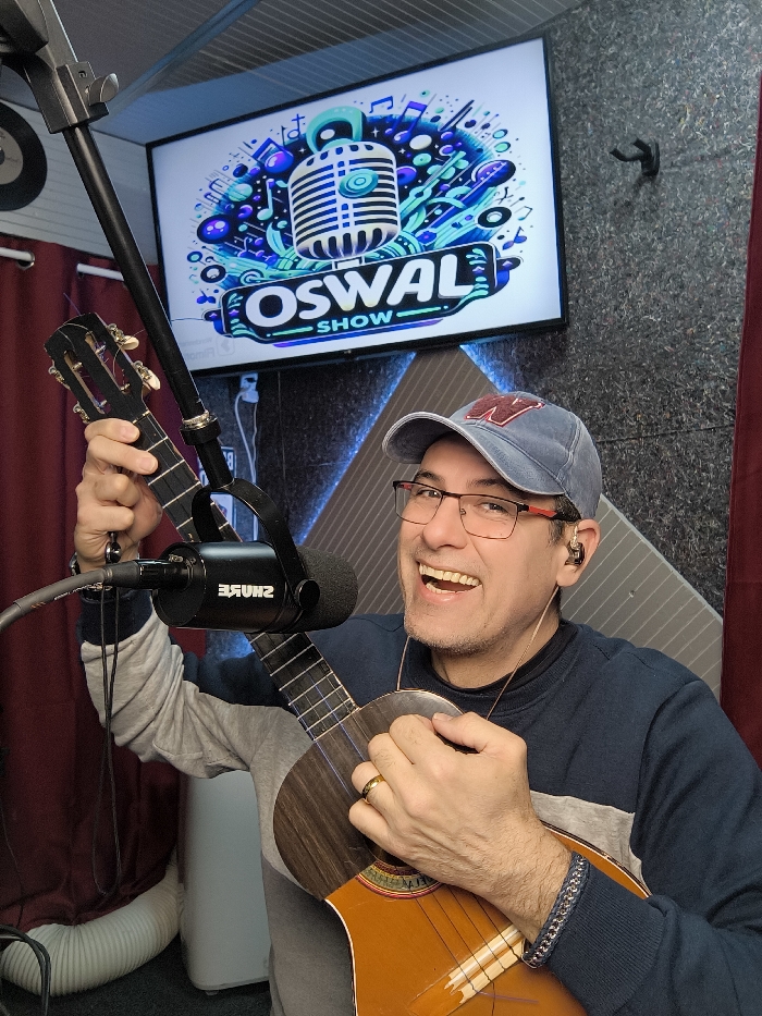 A man in a baseball cap and glasses holds a charango, positioned next to a Shure microphone on a stand. He's smiling with visible teeth. A television screen behind him displays "OSWAL SHOW" above a stylized microphone graphic. The background features textured walls, a visible vent, and red curtains. The man is wearing a ring and in-ear monitors. His sweatshirt is a two-toned mix of light gray and dark blue.