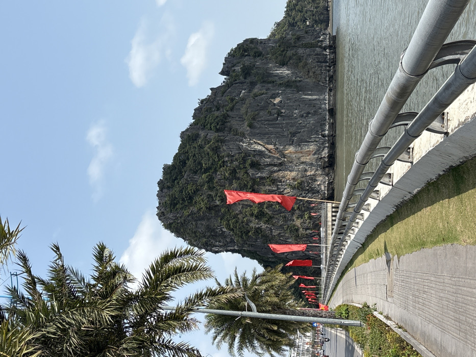 The image displays a coastal view in Hong Gai Ward, Vietnam, under a clear blue sky with sparse white clouds. In the foreground, a paved pedestrian sidewalk runs from left to right, bordered by a strip of green grass and a grey metal railing on a white concrete base that separates it from a body of water. Numerous red rectangular flags, mounted on bamboo poles, are uniformly placed along the railing's side. To the left of the sidewalk, a row of palm trees and streetlights lines a multi-lane road where several vehicles, including cars and motorcycles, are visible in the distance. Further left, beyond the road, white multi-story buildings are discernible. The dominant feature in the background on the right is a large, steep-sided karstic limestone island or mountain, densely covered in green vegetation on its upper sections, revealing grey rock cliffs at its base, rising directly from the water. No individuals are clearly depicted engaging in specific actions or interactions.