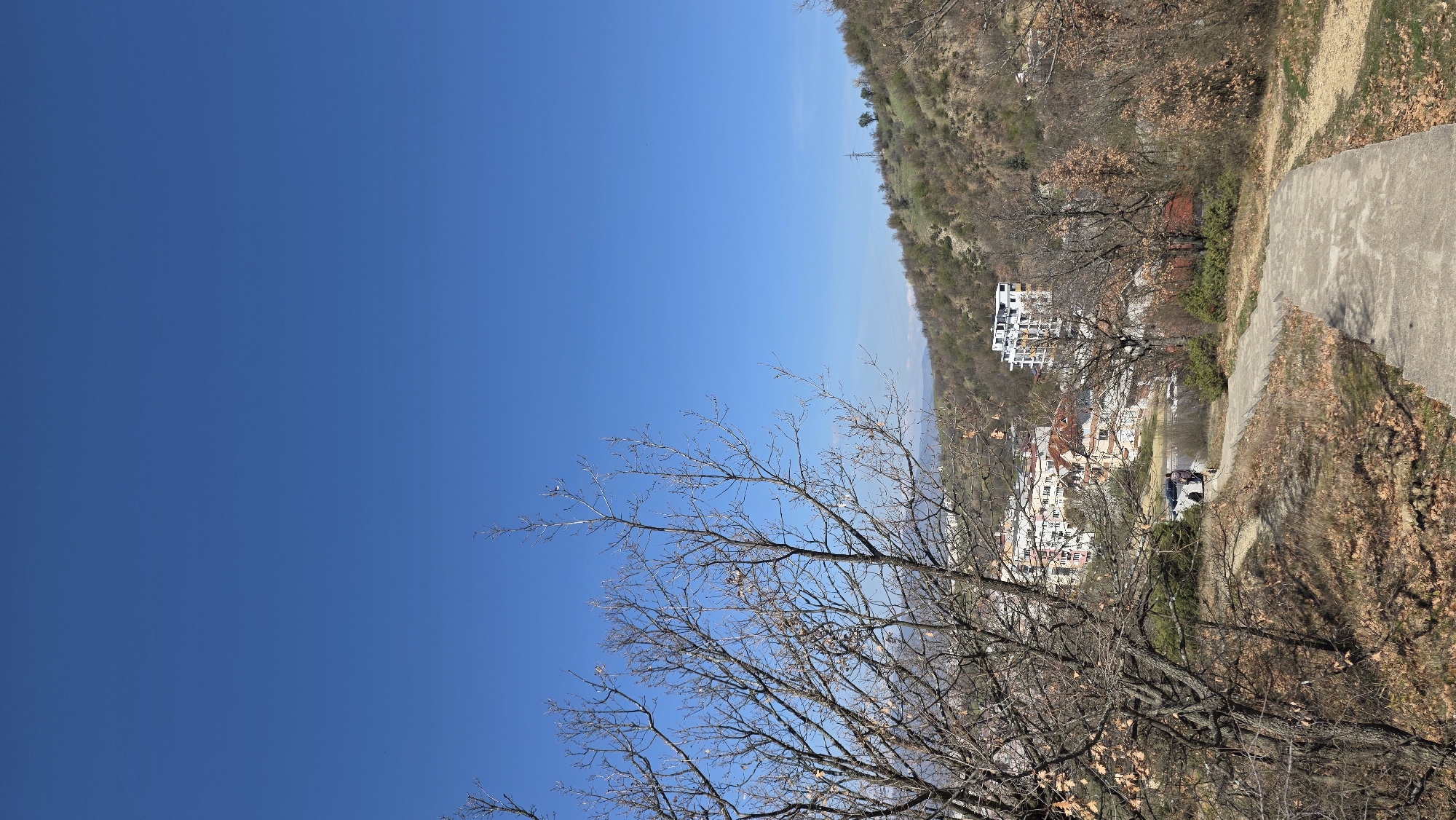 The image depicts a cityscape in Marulevo, Bulgaria, under a clear blue sky. A dense, leafless tree occupies the foreground. A paved path runs diagonally from the upper right toward the middle of the image. Buildings are visible along the slope, including a white apartment block higher up and residential buildings lower down. Two parked cars are on a road in front of the buildings. The landscape is hilly and primarily brown.