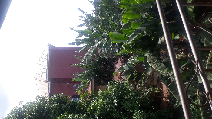 The image depicts a residential scene in Nsukka, Nigeria, viewed from a slightly elevated position, possibly a balcony. In the immediate foreground, a silver-colored metal railing, featuring ornate scrollwork, traverses horizontally across the lower portion of the frame. Beyond the railing, the midground and background are dominated by dense tropical vegetation and a building. Numerous large-leafed banana plants with vibrant green foliage are prominent, interspersed with other leafy trees, notably a tree with smaller, darker green leaves positioned on the left side of the frame. The terrain below the vegetation appears to be unpaved, with reddish-brown soil visible. In the background, a two-story building with reddish-brown exterior walls and a light-colored, multi-gabled corrugated metal roof stands against a bright, hazy sky. Two rectangular windows are visible on the building's side facade, one on the lower level (partially obscured) and another on the upper level. No individuals or discernible activities are present within the frame.