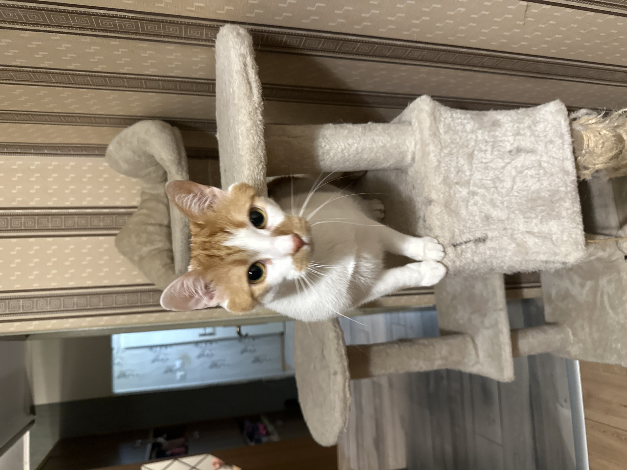 This image captures an indoor scene in Sofia, Bulgaria, featuring a bicolored cat. A domestic short-haired cat, primarily white with orange-ginger markings on its head, ears, and patches on its back, is positioned centrally, facing directly towards the camera. Its pupils are dilated, and its amber-colored eyes are open and directed forward. The cat stands on a beige, plush-covered, multi-level cat tree, with its front paws placed together on one of the platforms. The cat tree displays signs of wear, particularly on a sisal rope scratching post visible at the lower right. The background wall is covered with light beige wallpaper, patterned with alternating vertical stripes: one featuring small, stacked square motifs, and the other displaying smaller, lighter, 'Z'-shaped patterns. To the left of the cat tree, an open doorway reveals an adjacent room with a lighter-toned plank floor and a partially visible white interior door. Shelving or furniture with miscellaneous items, including pink articles, is discernible in the background room. The floor in the immediate foreground, to the left of the cat tree, is a darker plank flooring, separated from the lighter background flooring by a silver transition strip.