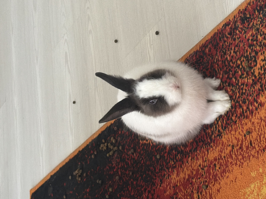 - "A dwarf rabbit, predominantly white with distinct dark brown or grey markings forming a blaze, eye patches, and ear coloration, is positioned centrally in an indoor setting" by FM-8mqz02, licensed under CC BY 4.0
