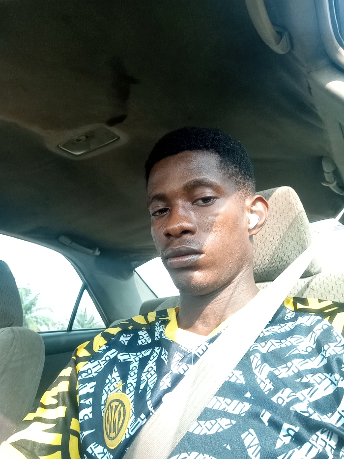 A young man sits in a car, wearing a black and yellow jersey with a seatbelt fastened. He has short, dark hair and an expressionless face. The car's interior is visible, including the seat headrest, a side window, and the roof. Daylight streams in, highlighting the dust and wear on the car's interior. A small white earbud is visible in his right ear. The photo is a medium shot with the man as the primary focus.