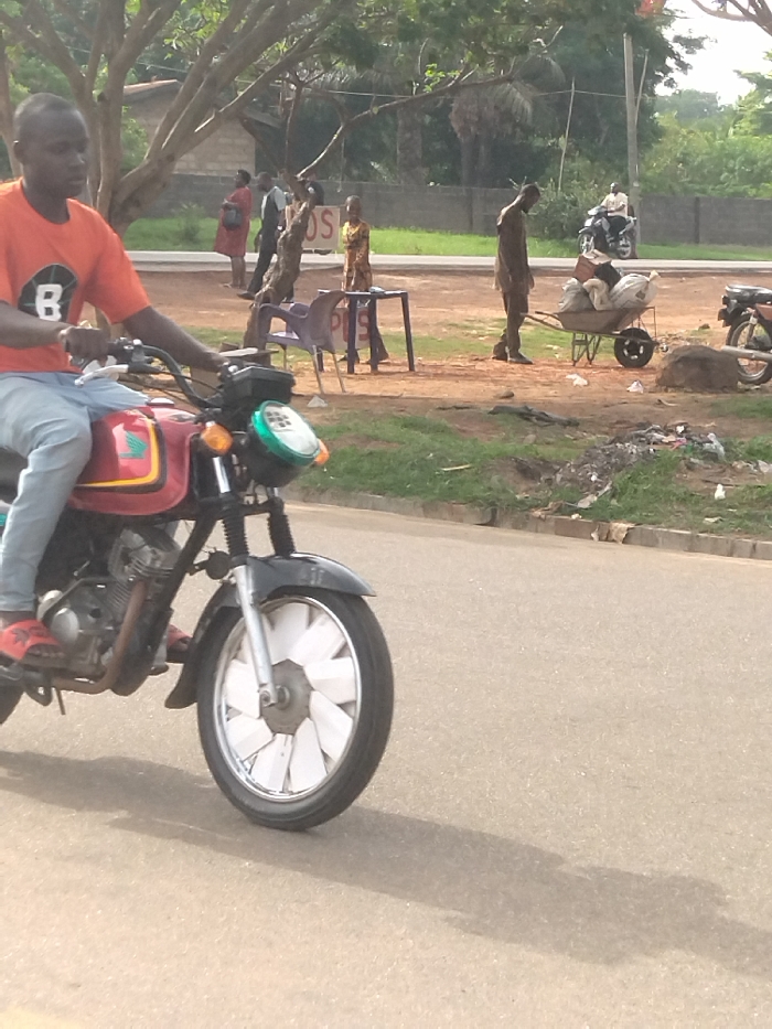 A man is riding a red and black motorcycle with a white spoke wheel on the right side of a paved road. The motorcycle is traveling toward the right side of the image. He is wearing an orange t-shirt with a black number eight on the front and blue jeans. The man is wearing red sneakers. The motorcycle has a green headlight. There is a large tree to the left of the motorcycle. In the background, on the right side of the image, there is a man with a wheelbarrow. The wheelbarrow is filled with white bags. The wheelbarrow is resting in an area that appears to be dirt and grass. There are two other men standing in the distance, and two other men walking away from the camera on the left side of the image. The men in the background are wearing casual clothing. There are several signs in the background, as well as a concrete structure. The location of the photo is in the city of Asaba, Nigeria, located at latitude: 7.681, longitude: 8.537.