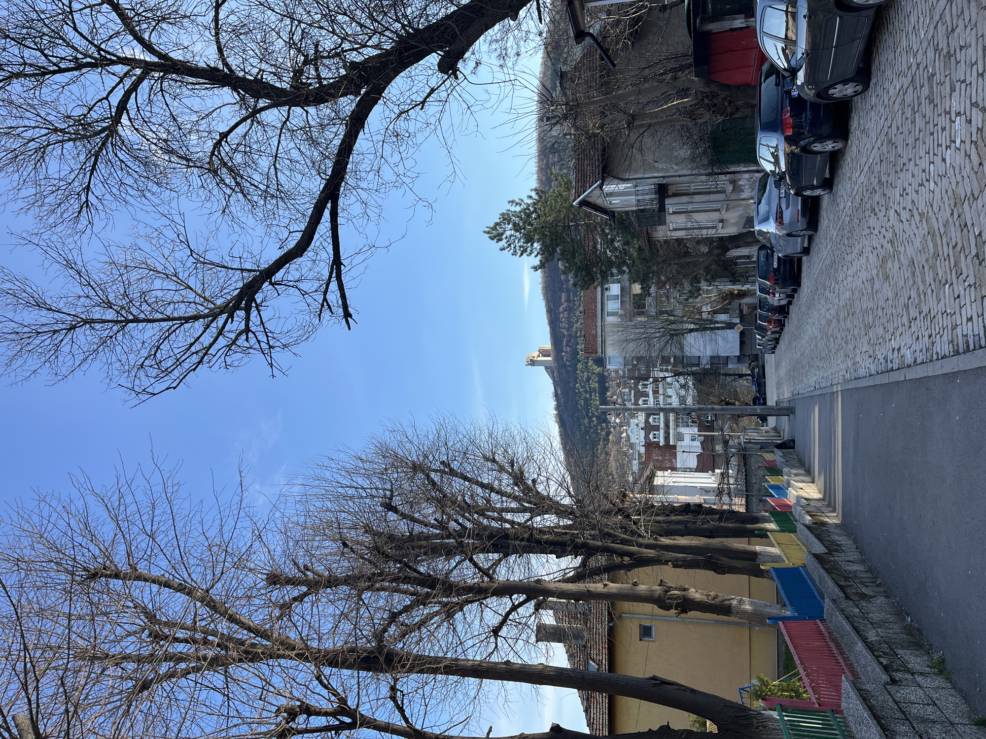 street in Shumen, Bulgaria. The view is oriented along a narrow paved road flanked on one side by parked cars and buildings, and on the other by a low concrete wall painted in a rainbow of colors, behind which stand buildings and bare trees. The sky is clear blue, and leafless tree branches occupy the upper part of the frame. The scene appears to be in a residential area with the buildings positioned along a slope or hillside.