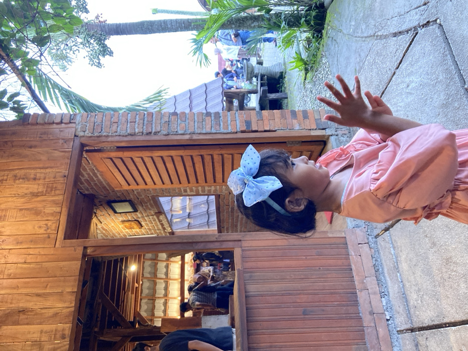 A young Indonesian girl, wearing a salmon-pink ruffled dress and a light blue polka-dotted bow headband, stands outdoors in Selotapak, Indonesia. She is positioned with her right side facing the viewer, her hands raised and fingers spread forward, looking towards the right out of frame. Behind her to the left is a building with a wooden upper facade and exposed brick lower section, featuring an open doorway revealing an indoor area with multiple individuals and a corrugated metal ceiling. A window in the brick wall has the word "Gartenhütte" visible. To her right, the outdoor environment includes a concrete ground, various green plants, and tall palm trees under a bright sky. Further in the background, a small gazebo with a tiled roof is visible, along with more people and parked motorbikes.