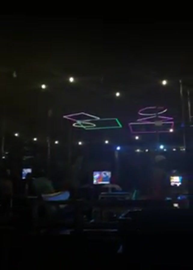 n outdoor bar or cafe at night. Several people are seated at tables watching TV screens that display sports matches. String lights hang overhead, interspersed with neon light fixtures in geometric shapes like squares, circles, and hexagons. The area is dimly lit, casting most of the scene in shadow, but the screens and neon provide distinct points of light. There is music playing in the background.