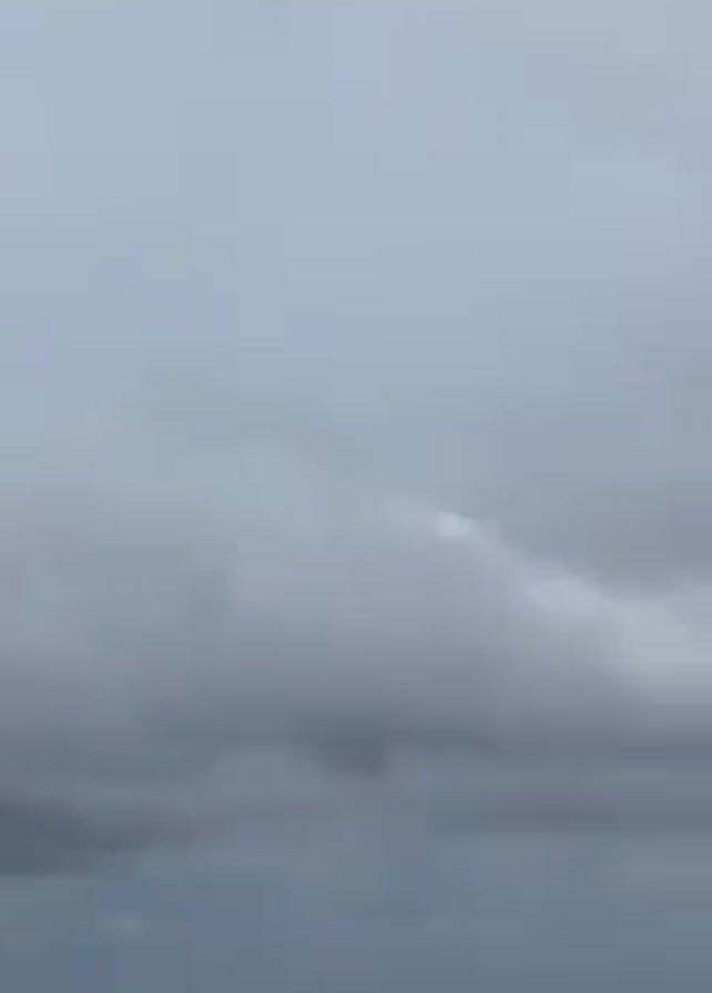 paraglider against a cloudy sky. The camera pans down to reveal a panoramic view of a coastline. A beach stretches along the shore, bordered by waves crashing against the sand. Lush green hills rise on the right side of the frame, dotted with houses. The sky is overcast, creating a gray tone over the ocean.