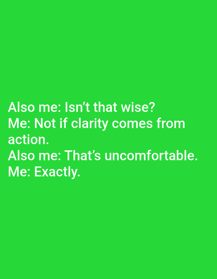 This digital image displays white, sans-serif text centered on a solid, vibrant green background. The text is organized as a four-line dialogue. The first line states: "Also me: Isn't that wise?". The second line follows: "Me: Not if clarity comes from action.". The third line reads: "Also me: That's uncomfortable.". The final line concludes: "Me: Exactly.". No human figures, specific environments, or physical objects other than the text on the colored background are visually depicted within the image frame. This scene is located in Kharkiv, Ukraine.