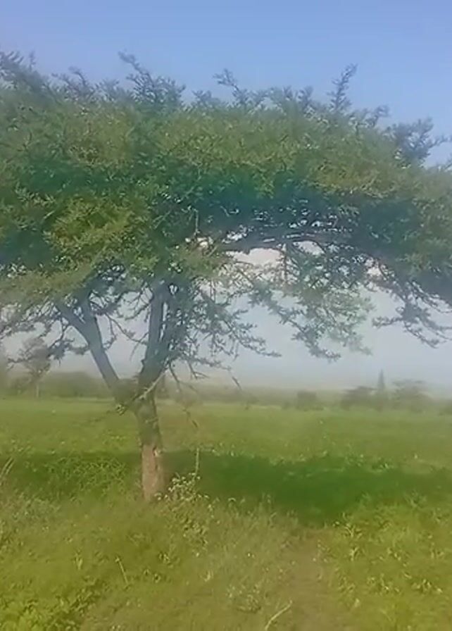 tree standing in a grassy field under a blue sky with some clouds. The tree has a broad, umbrella-like canopy. The grass is green and lush. In the distance, there are hints of other trees and vegetation. A dirt path leads up to the tree. The video appears to be shot on a somewhat hazy day.