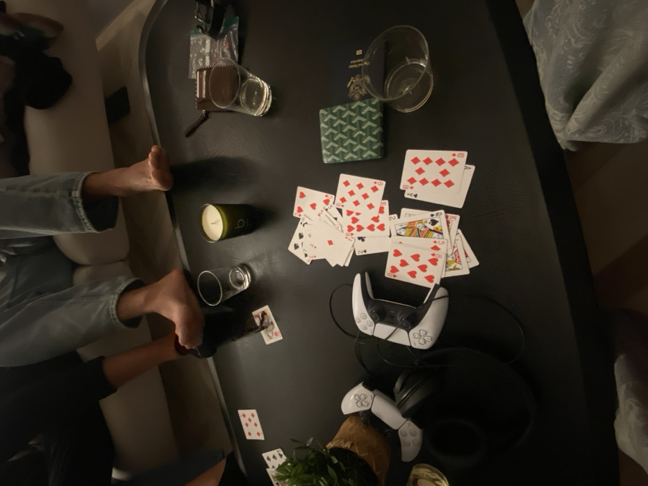 An overhead, slightly angled view shows a dark, rectangular coffee table serving as a surface for various items, including leisure and gaming accessories, in an indoor setting within the city of New York, United States. Two individuals are partially visible in the background, seated on a light-colored sofa, with their bare feet positioned on or near the table. One person wears light blue denim jeans, and the other wears dark pants. The table's surface displays multiple playing cards, indicating a game in progress. Specific visible cards include a 7 of diamonds, an 8 of hearts, a Queen of spades, a 7 of hearts, a 2 of hearts, a King of hearts, a Jack of hearts, an Ace of hearts, a 10 of diamonds, and an Ace of diamonds, among other obscured cards in various piles. To the left, a small potted plant with green foliage rests in a brown, textured pot. Adjacent to it are two white PlayStation 5 DualSense controllers, connected by a black cable, positioned near a pair of black over-ear headphones. Central to the table is a dark green candle in a glass holder, bearing a "b." brand label, with a white wick visible. Nearby, a clear empty glass tumbler is present. On the right side of the table, another clear glass tumbler contains a transparent liquid. A small brown leather pouch or wallet and a clear plastic bag containing small, dark, unidentifiable objects are positioned next to this glass. Further right, a rectangular item with a green geometric pattern (Goyard style) lies next to a dark blue United States passport or small notebook featuring an eagle emblem. An empty, clear, circular glass item, possibly an ashtray or coaster, is also visible. The overall scene suggests a casual social gathering involving card games and potentially video gaming.