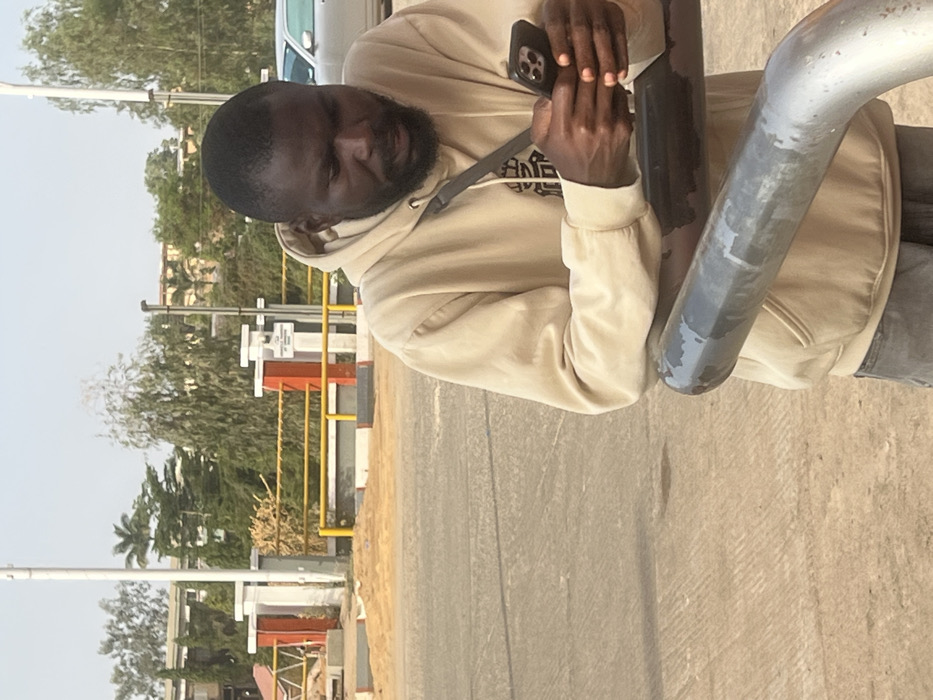 A man with a beard in a tan hoodie is photographed from a high angle while holding a phone. He is standing next to a curved, gray metal railing. In the background is a road, trees, and what appears to be a gated structure with white, orange, and yellow accents. The sky is visible above the trees and the gate. The image appears to be taken during the day with natural light.