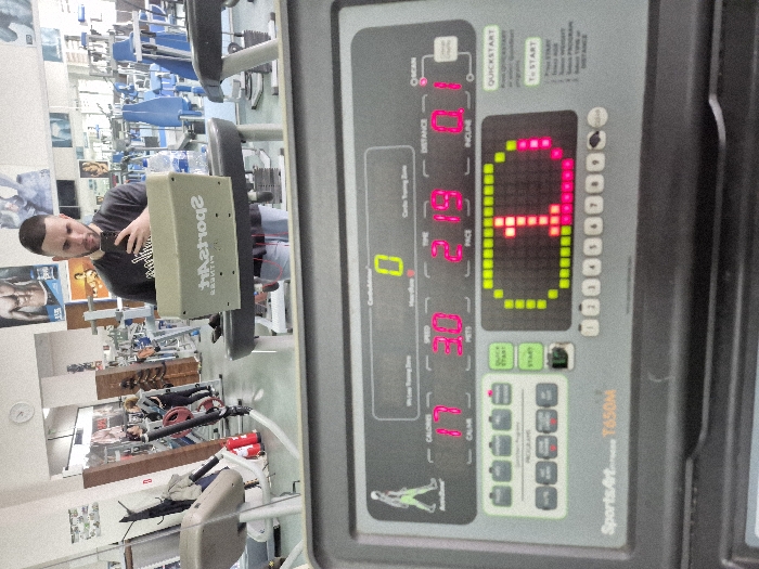 The image depicts the interior of a fitness center in Kavarna, Bulgaria, captured from the perspective of a user on a treadmill. The foreground is dominated by the console of a SportsArt T650M treadmill, which displays "CALORIES 17," "SPEED 3.0," "PACE 2:19," and "DISTANCE 0.1." A large central LED display on the console shows the number "1" in red, surrounded by green illuminated segments. Reflected in a large mirror positioned in front of the treadmill is a male individual, appearing to be in his late 20s or early 30s, with short dark hair and a beard. He is wearing a dark t-shirt with "SportsArt Fitness" text (reversed due to reflection) and light-colored shorts. He holds a black smartphone in his right hand, angled towards the mirror, indicating he is taking the photograph. Red earbuds are visible around his neck or in his ears. The background, also visible in the reflection, showcases a spacious, well-lit gymnasium furnished with various exercise equipment. This includes multiple treadmills, weight machines, and areas with free weights and racks. Promotional posters featuring muscular physiques and fitness-related imagery are affixed to the white walls. At least two other individuals are present in the gym's background: one person is seen near a red-weighted bar and another is further back, partially obscured by equipment. A green "SportsArt Fitness" branded stand or holder is positioned on the treadmill's console in front of the male subject, alongside a clear plastic water bottle. A clock is visible on the upper left wall in the reflection.