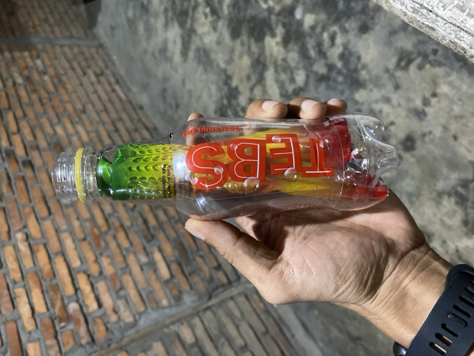 A close-up image depicts a person's right hand gripping a clear plastic beverage bottle. The scene is located in Seuneubok Teungoh, Indonesia. The hand, with visible knuckles and a darker skin tone, holds the bottle vertically. A black digital watch or fitness tracker is worn on the wrist. The bottle contains a colorful substance or internal packaging, transitioning from green at the top, through yellow, to red at the base. The prominent label, visible through the clear plastic, displays "TEBS" in large red letters with white bubble accents, vertically oriented. Smaller text "Sparkling Tea" is also visible. The bottle's neck is threaded and lacks a cap, but a yellow tamper-evident ring is present below the threads. The background consists of a reddish-brown brick wall with dark grey mortar lines. Below the wall and extending into the lower right foreground is a dark grey concrete or paved surface.