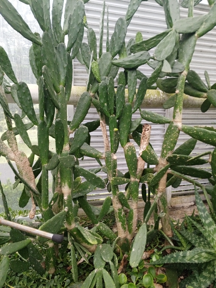 A collection of prickly pear cacti dominates the frame. They are varying shades of green and covered with small prickles. Some pads show signs of aging with a tan, textured appearance. The cacti grow closely together, with some pads appearing stacked on top of each other. In the lower right corner, there is an aloe plant. A metal support is also visible in the lower left. The background is blurred, suggesting a greenhouse environment with a translucent wall.