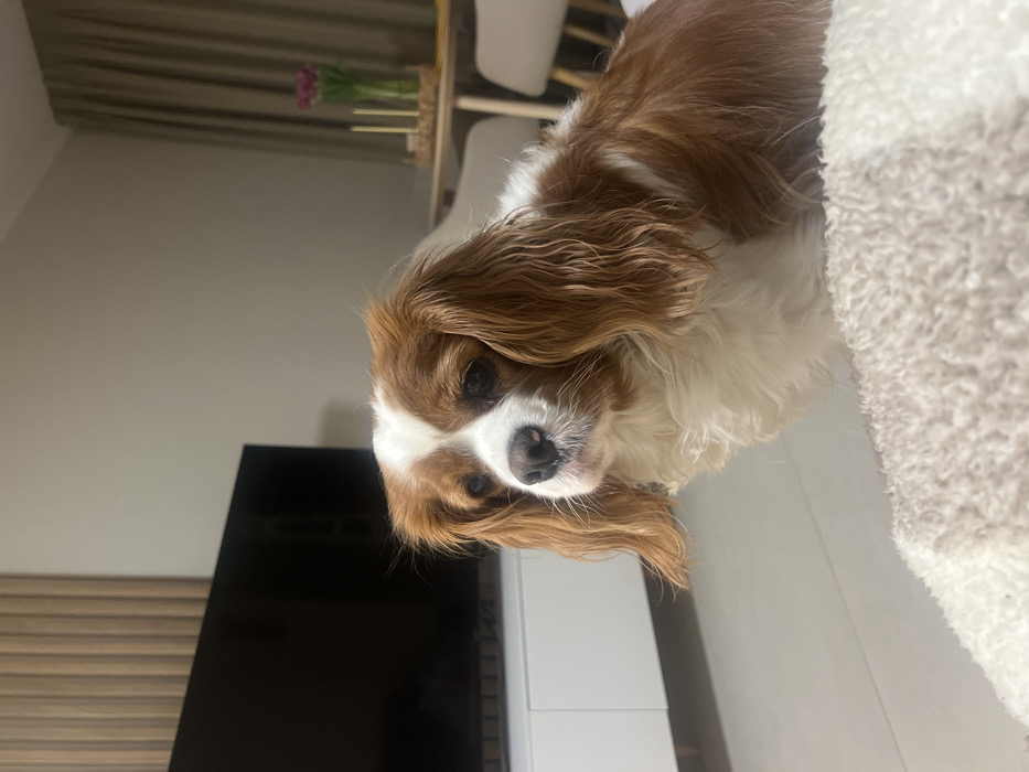 - "A Blenheim Cavalier King Charles Spaniel, exhibiting white fur with chestnut brown patches on its head, ears, and body, is positioned in an indoor residential setting in the city of Sofia, Bulgaria" by FM-Tqqde2, licensed under CC BY 4.0