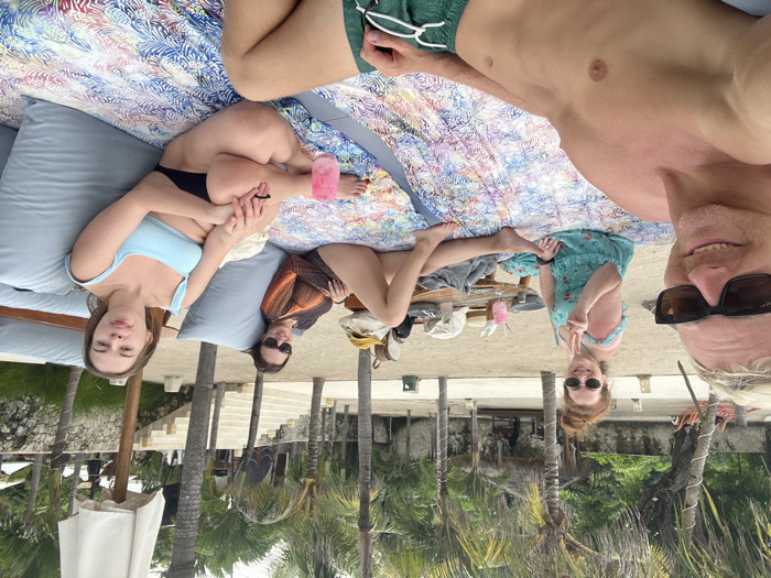 A group of four people are relaxing on a beach. Two women are lying on a cushioned lounge area covered with a patterned fabric, one in a blue top and black bottoms, the other in a brown patterned top. A shirtless man in green swim trunks stands next to them. On the other side, another woman in a blue floral dress is throwing a peace sign. Palm trees and a building with stairs can be seen in the background. A man with sunglasses is taking the picture.