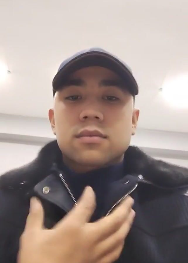 A man is shown indoors in a medium close-up shot from a low angle, placing the camera slightly below him, looking up at him. He is wearing a dark blue baseball cap, a dark turtleneck sweater, and a dark blue jacket with a black faux fur collar. He's zipping up the jacket with his right hand. The background appears to be a commercial or institutional setting, with a white ceiling and recessed lighting.