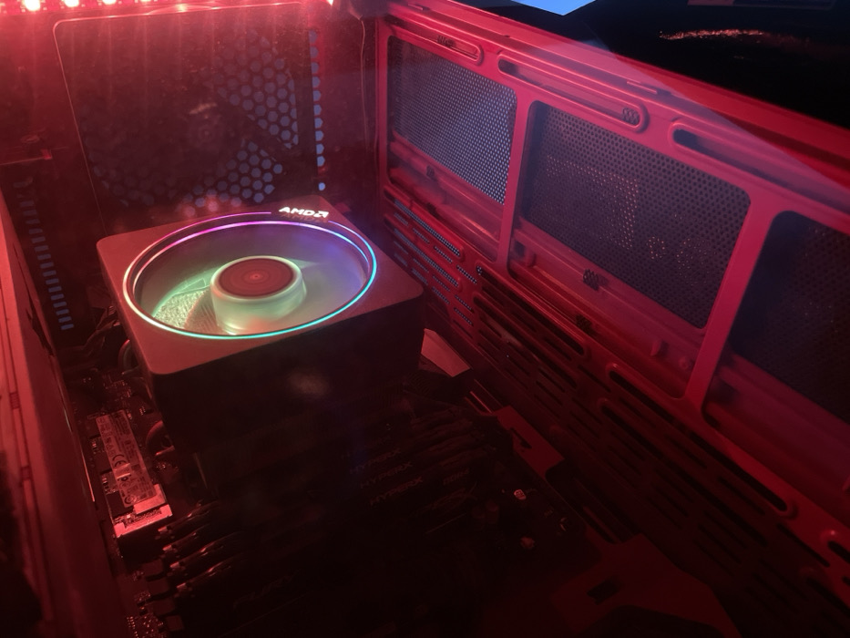 Inside a red-lit computer case, an AMD CPU cooler with a glowing circular fan sits prominently