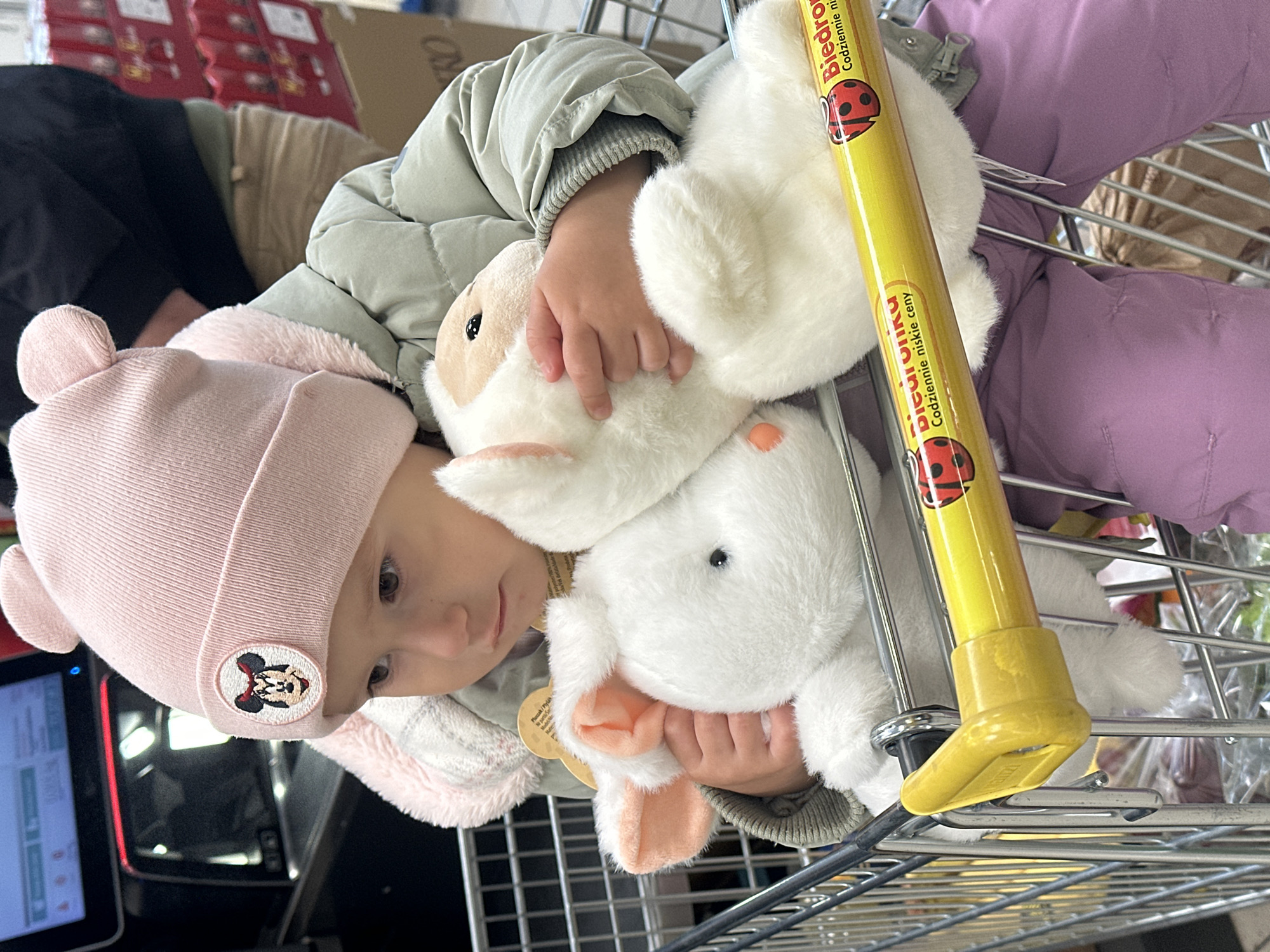 A young child, wearing a pink hat with a Mickey Mouse emblem and a light green padded jacket, sits in a shopping cart. The child is holding two plush rabbit toys. The shopping cart has a yellow handle with a "Biedronka" logo and a ladybug image on it. The image was likely taken at a Biedronka store in Wisła, Poland. A checkout counter is partially visible on the left side of the frame, indicating the store's interior.