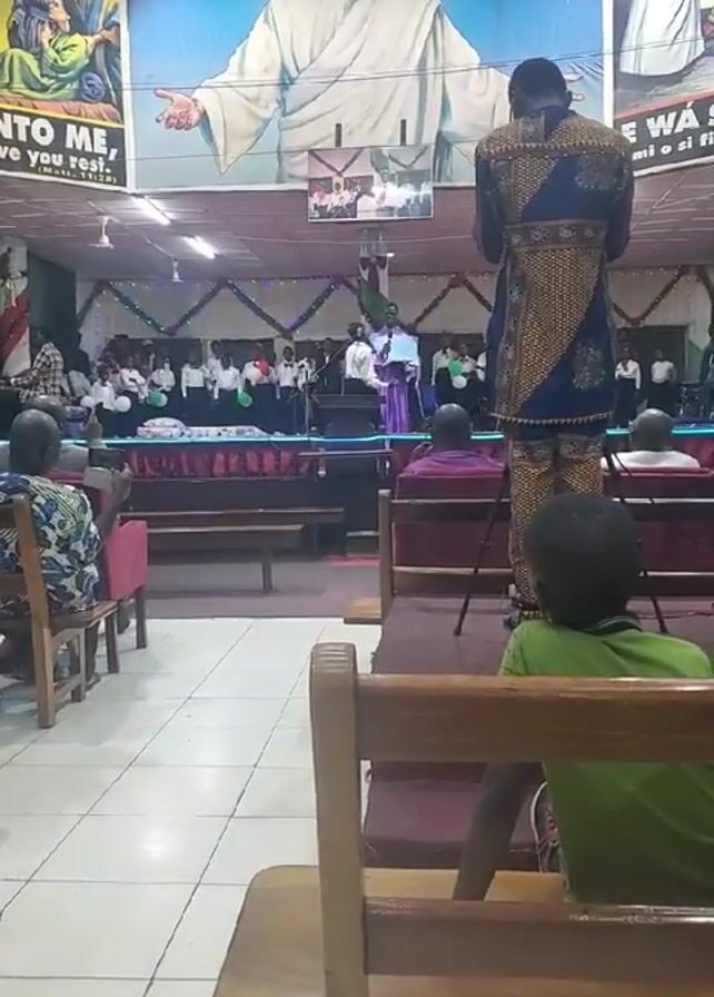 inside of a church. A large picture of Jesus hangs on the wall behind a stage. A choir wearing white shirts stands on the stage, along with a man in a white robe and another man with a microphone. In front of the stage is the congregation, seated on wooden benches. A man in a colorful patterned outfit stands near the front, appearing to operate a camera on a tripod. In the foreground, a person wearing a green shirt is sitting on a wooden chair. The camera is fairly still.
