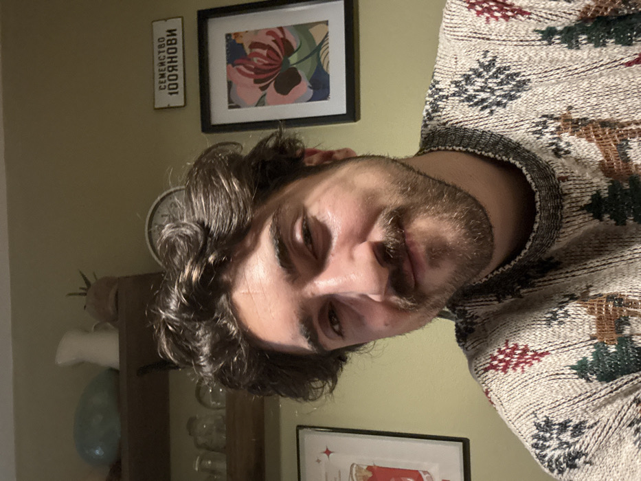 An indoor scene in Primorsko, Bulgaria, features a male subject occupying the central and lower portions of the frame. The male has medium-length, wavy dark brown hair and a short beard. He is observed looking directly forward with a subtle smile, exhibiting slightly narrowed eyes. He is wearing a long-sleeved, crew-neck knitted sweater with an off-white base color and a repeating pattern of green pine trees, brown deer, and red and dark blue geometric designs. The background consists of a light olive-green wall. On the upper left, a wooden shelf holds a light blue pear-shaped object, a white ceramic pitcher, and a small potted plant. Below this, a second wooden shelf is partially visible, displaying several clear glass items. To the lower left, a portion of a framed illustration depicting a red cocktail in a glass is visible. On the upper right wall, a white rectangular sign with Cyrillic text reading "СЕМЕЙСТВО ИОАЯНОВИ" (IOANOVI FAMILY) is affixed. Directly below this sign, a black-framed picture displays a colorful, stylized floral illustration with predominantly pink, red, green, and blue hues. A round wall clock with a white face is partially visible behind the subject's head in the upper-right quadrant. The lighting suggests an artificial indoor source.