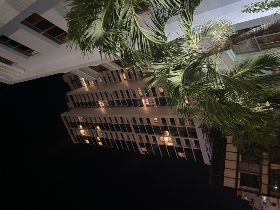 The image presents an urban night scene in Nha Trang, Vietnam. A tall, multi-story building, likely a hotel or residential high-rise, dominates the central and left areas, featuring numerous rectangular windows and balconies, many of which are illuminated with warm, yellow light. The building's facade is light-colored, with a dark grid pattern of windows, and a distinctive wavy blue and white pattern is visible on a lower section. To the right, a segment of an adjacent, lighter-colored (white/light blue) building is visible, also with windows. Several palm trees with broad green fronds occupy the foreground and middle ground, partially obscuring the buildings, with some displaying clusters of white or light-colored inflorescence. A dark night sky is visible in the upper left, while a shorter, brown-toned building with large windows is present at the lower left. No individuals are visible in the scene.