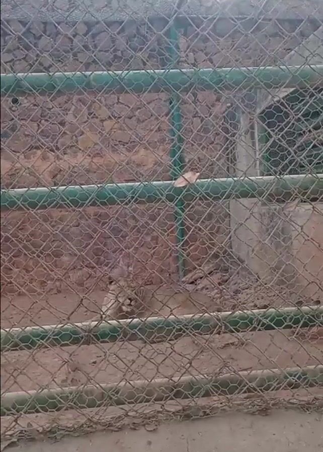 lion lying in a cage. The cage is made of green metal bars and chain link fencing. The floor of the cage is dirt. Behind the cage is a stone wall and some sort of shed. The lion is mostly still and in the center of the frame. People can be heard talking in the background.