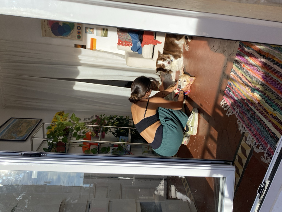 The image displays an indoor scene within an apartment in Barcelona, Spain, illuminated by bright natural sunlight. A female individual, viewed from the back and side, is crouched on a reddish-brown hexagonal tiled floor, wearing a black sports top and loose-fitting dark green pants with light green sneakers. She is actively engaging with a light-colored dog lying on its back or side. Adjacent to them, a brown and white Border Collie-type dog rests on the floor, observing the scene. In the foreground, a multicolored striped rug with fringe is partially visible. To the left, a tall, narrow metal shelf unit holds several potted plants and various decorative items. The background features white sheer curtains, a light-colored armchair with a blue cushion, and a red textile draped over it. Framed artworks, including a "CHROMATIC SCALE" diagram and landscape prints, are mounted on the wall. A white-framed glass door or window on the left reflects an outdoor view of the sky.