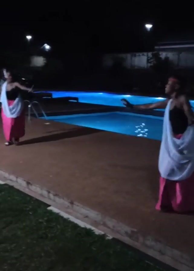 three people performing a traditional dance by a pool at night. The dancers are wearing dark tops, pink skirts, and white shawls draped over their shoulders. They are moving in a coordinated fashion, their arms and bodies flowing with the music. The pool is lit with a bright blue light, and the surrounding area is dark except for a few streetlights. The dancers are on a stone patio next to the pool, with a grassy area behind them. The audio includes the sound of drumming, singing, and cheering, adding to the festive atmosphere.